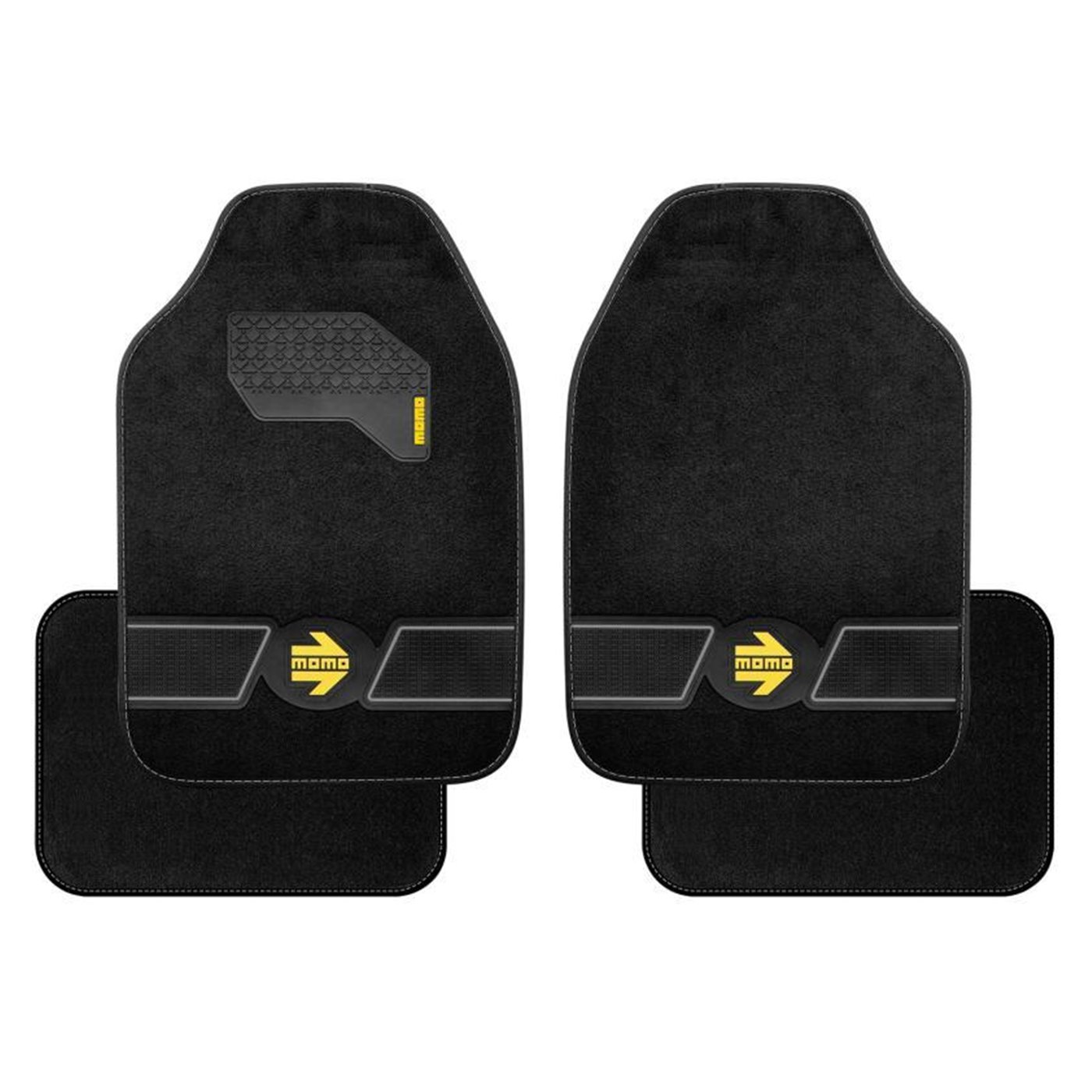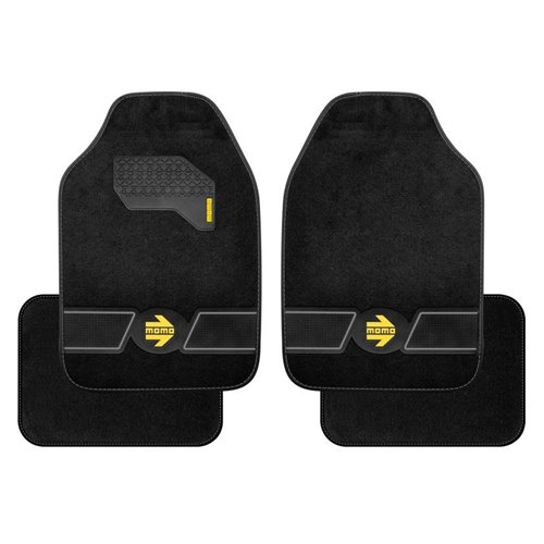 Serie completa 4 tappeti (anteriori+posteriori) adattabili alla maggiorparte dei pianali. Realizzati in resistente moquette nera con battitacco in pvc sul lato guida. Provvisti di fondo antiscivolo e robusto profilo esterno. Colore nero con logo MOMO giallo e cuciture/strisce grigie.