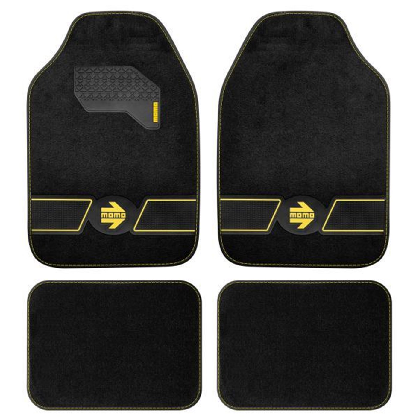 Serie completa 4 tappeti (anteriori+posteriori) adattabili alla maggiorparte dei pianali. Realizzati in resistente moquette nera con battitacco in pvc sul lato guida. Provvisti di fondo antiscivolo e robusto profilo esterno. Colore nero con logo MOMO giallo e cuciture/strisce gialle.
