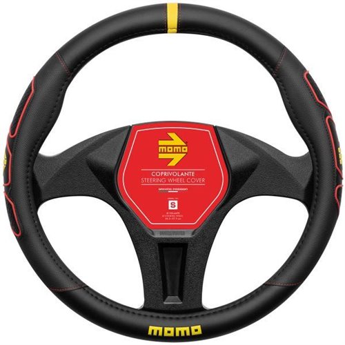 Coprivolante in morbido pvc liscio con impugnature traforate. Garantisce un'impugnatura perfetta per il miglior comfort di guida. Colore nero con cuciture rosse e logo MOMO giallo. Per volanti di diametro 38-39 cm.