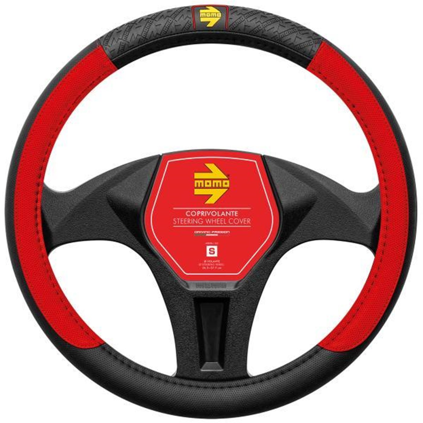 Coprivolante in morbido pvc liscio con impugnature traforate. Garantisce un'impugnatura perfetta per il miglior comfort di guida. Colore nero con impugnature rosse e logo MOMO giallo. Per volanti di diametro 38-39 cm.