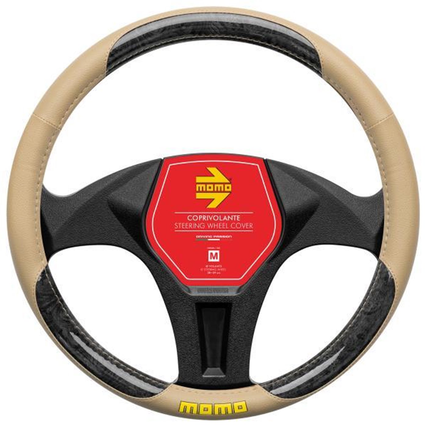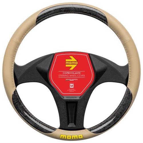 Coprivolante in morbido pvc beige con inserti in pvc effetto legno lucido nero e logo MOMO giallo. Garantisce un'impugnatura perfetta per il miglior comfort di guida. Per volanti di diametro 38-39 cm.