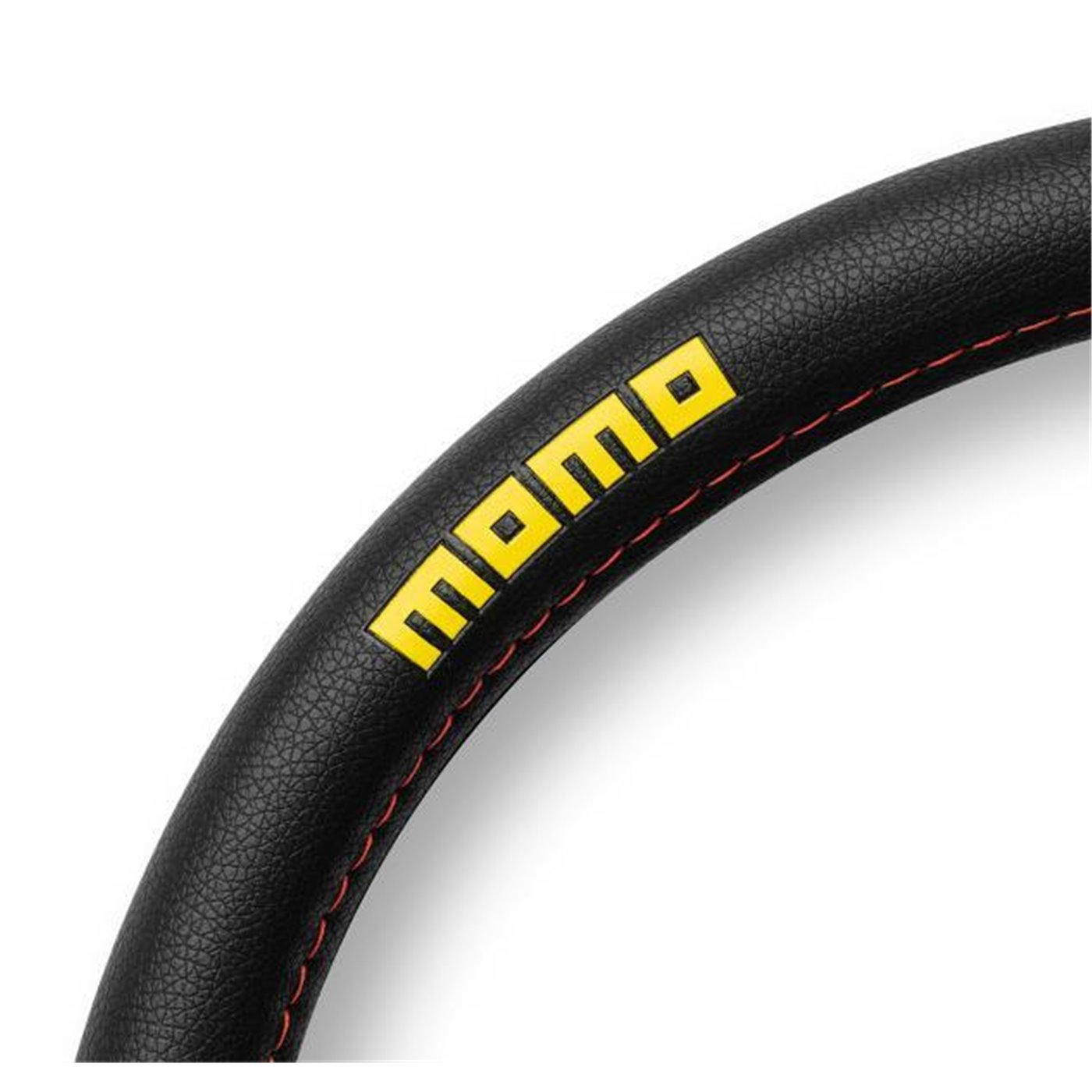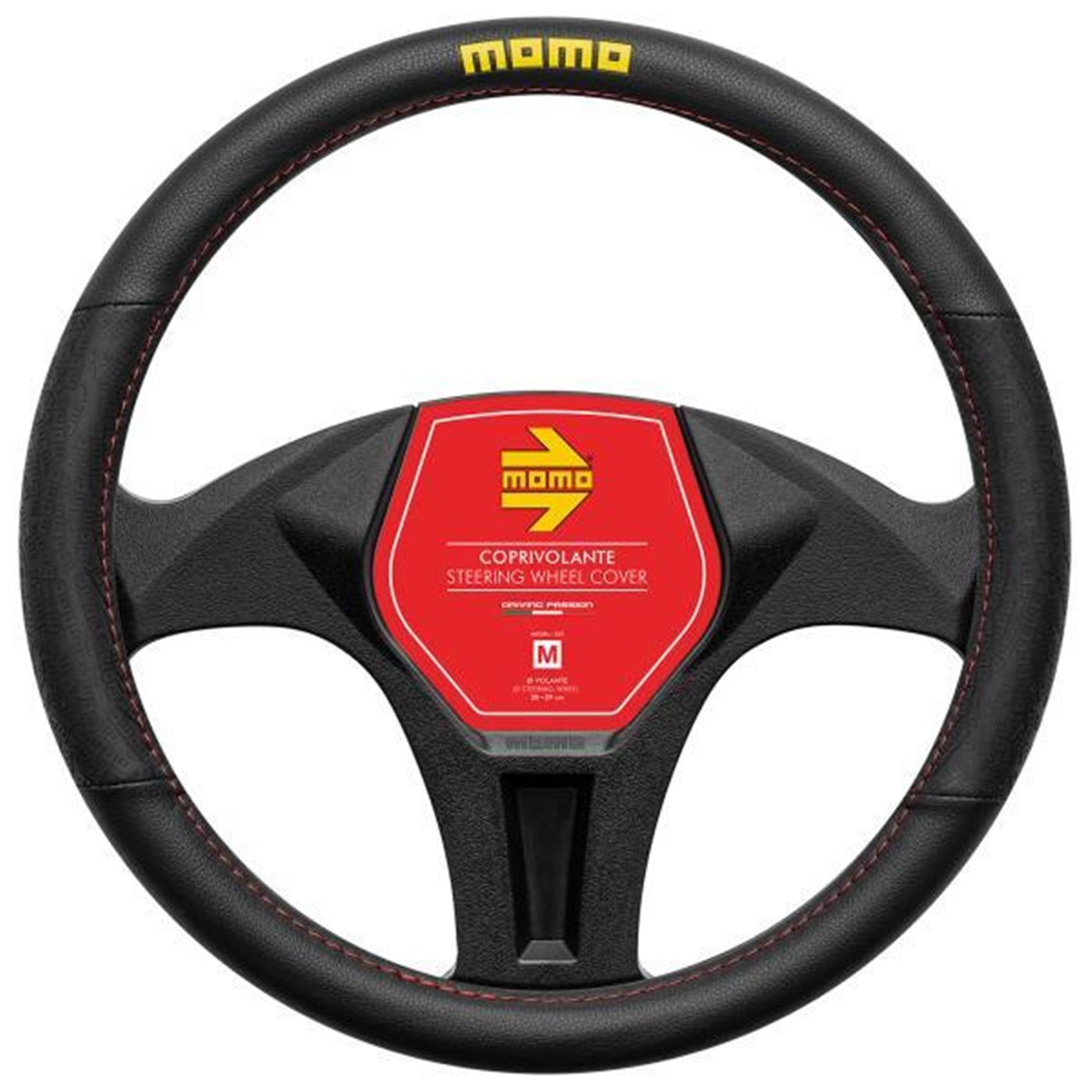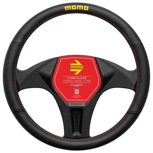 Coprivolante in morbido pvc con inserti in gomma antiscivolo. Colore nero con cuciture rosse e logo MOMO giallo. Garantisce un'impugnatura perfetta per il miglior comfort di guida. Per volanti di diametro 38-39 cm.