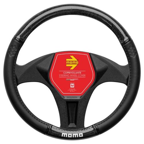 Coprivolante in morbido pvc. Garantisce un'impugnatura perfetta per il miglior comfort di guida. Colore nero con inserti in pvc effetto legno in radica lucida nera e logo MOMO bianco. Per volanti di diametro 38-39 cm.