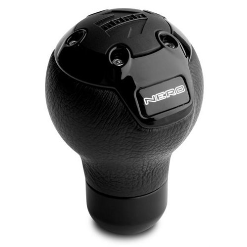 Pomello del cambio in pelle nera top grain e lucido con inserto logo MOMO in gomma.