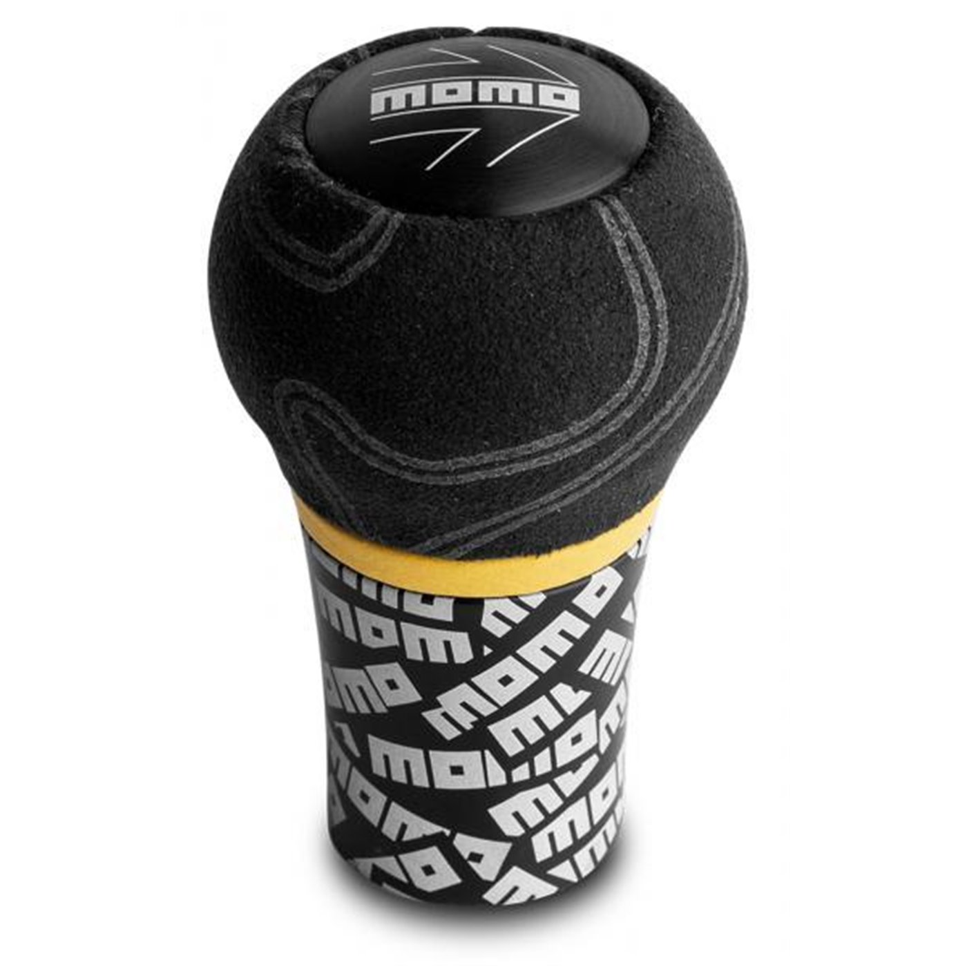 Pomello del cambio in microfibra nera serigrafato con le sagome dei circuiti più famosi del mondo. Inserto in pelle gialla e corpo in alluminio nero.