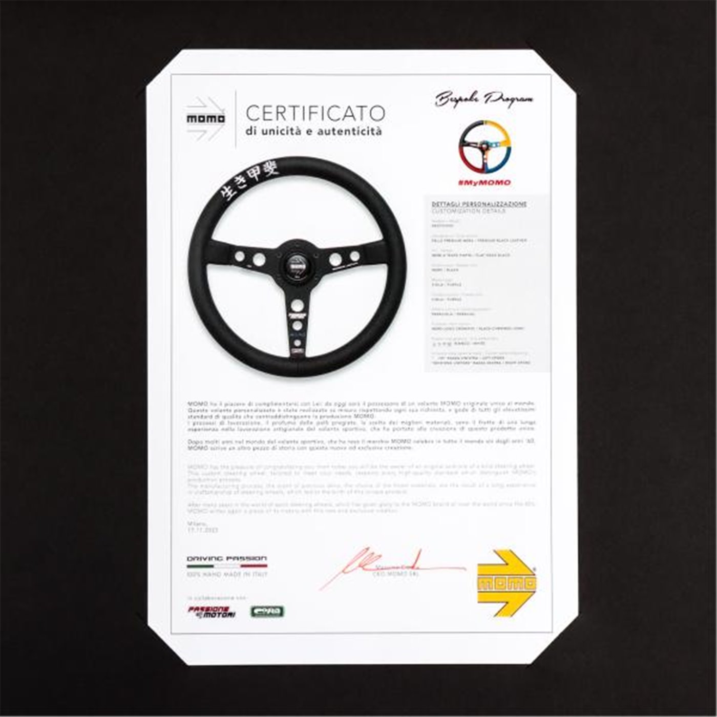 Dall'esclusiva collaborazione voluta da CO.RA., MOMO x Passione Motori, nasce un volante in edizione limitata unico al mondo. Ogni volante è numerato e ne sono stati realizzati solo 30 esemplari. Il cofanetto è composto da: scatola MOMO "Bespoke Program", volante numerato, certificato di autenticità e kit per l'installazione del volante. N.B. L'espositore per volante MOMO non è incluso nel cofanetto, ma è disponibile su richiesta. Modello volante: "Prototipo" Impugnatura: pelle Premium nera Viti: nere a testa piatta Razze: nere Logo MOMO: viola Cucitura: viola Pattern cucitura: parallela Pulsante clacson: nero con logo MOMO cromato Ricamo impugnatura: bianco Significato ricamo: dal giapponese "ikigai", ossia: ragione di vita, qualcosa per cui vivere, senso della propria esistenza Incisione personalizzata: "n°/30" su razza sinistra, "Edizione Limitata" su razza destra, logo Passione Motori su razza centrale ATTENZIONE: per installare il volante è necessario acquistare il mozzo MOMO adatto al modello della propria auto.