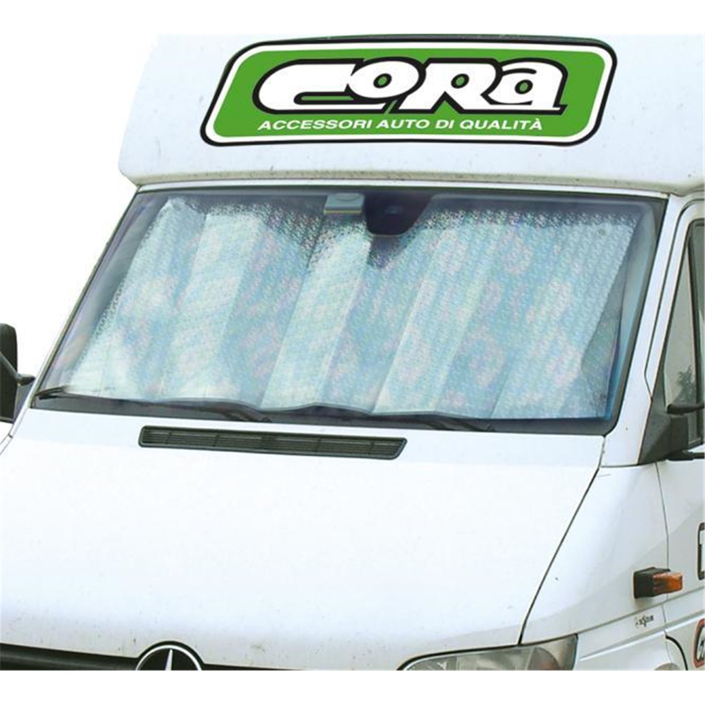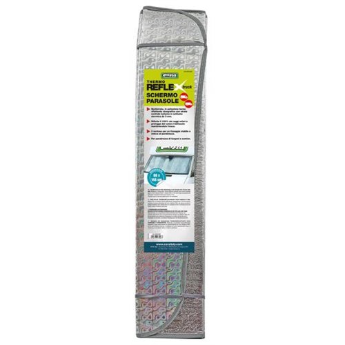 Schermo parasole termico anteriore per parabrezza. Multistrato: in poliestere termo riflettente oleografico con strato centrale isolante in schiuma atermica da 3 mm. Riflette il 100% dei raggi solari e protegge dal calore l’abitacolo mantenendolo fresco. 2 ventose per un fissaggio stabile e veloce al parabrezza. Dimensioni: 146x80 cm.