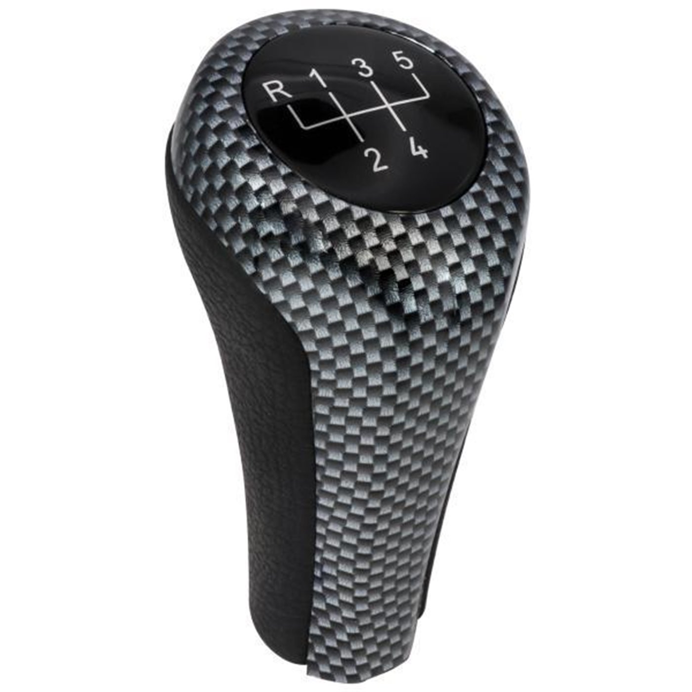 Pomello per cambio manuale 5 marce. Colore nero/carbonio. Compatibile con: BMW Serie 3 4p. 05>11 (E90) e Touring 05>12 (E91), Serie 3 4p. 12>19 (F30), Serie 3 Coupé 06> (E92), X5 04>13 (E53-E70).