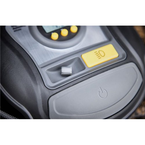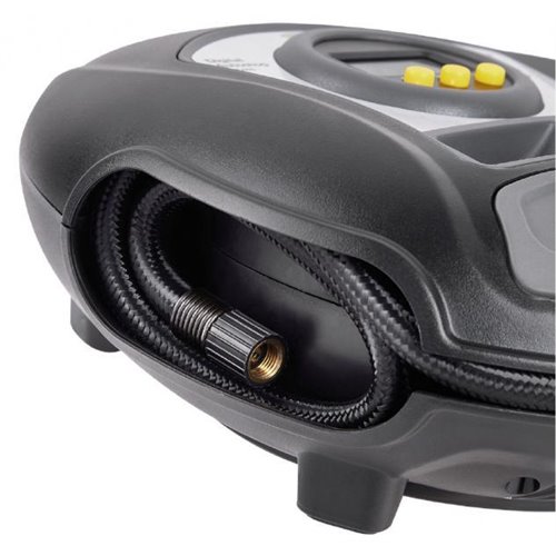 Compressore 12V con manometro digitale programmabile: si ferma automaticamente al raggiungimento della pressione desiderata e la memorizza per l’utilizzo successivo. Ampio display con scala di misurazione in PSI, BAR e kPA. Provvisto di tubo di gonfiaggio flessibile progettato per evitare eventuali grovigli e di raccordo valvola in grado di raggiungere agevolmente anche le valvole pneumatico posizionate in modo scorretto. Design piatto e luce bianca laterale direzionale per la massima stabilità e illuminazione dove necessario. Vano portaoggetti per tappi valvola. Ampio bottone On/Off per un facile utilizzo con mani sporche/unte o in condizioni di scarsa illuminazione. Cavo di alimentazione da 3 m con avvolgi cavo e spina con fusibile 12V DC. Kit di 3 adattatori di gonfiaggio per bici, materassini ed altre attrezzature in dotazione. Gonfia un pneumatico in meno di 4 minuti (dato stimato considerando una pressione di gonfiaggio di 35 PSI su uno pneumatico da 13"). DATI TECNICI: tensione in ingresso 12 V - potenza 120 W - assorbimento max 10 A - pressione max 80 PSI - lunghezza tubo aria 50 cm - lunghezza cavo 3 m - dimensioni: 197A x 180L x 80P mm.