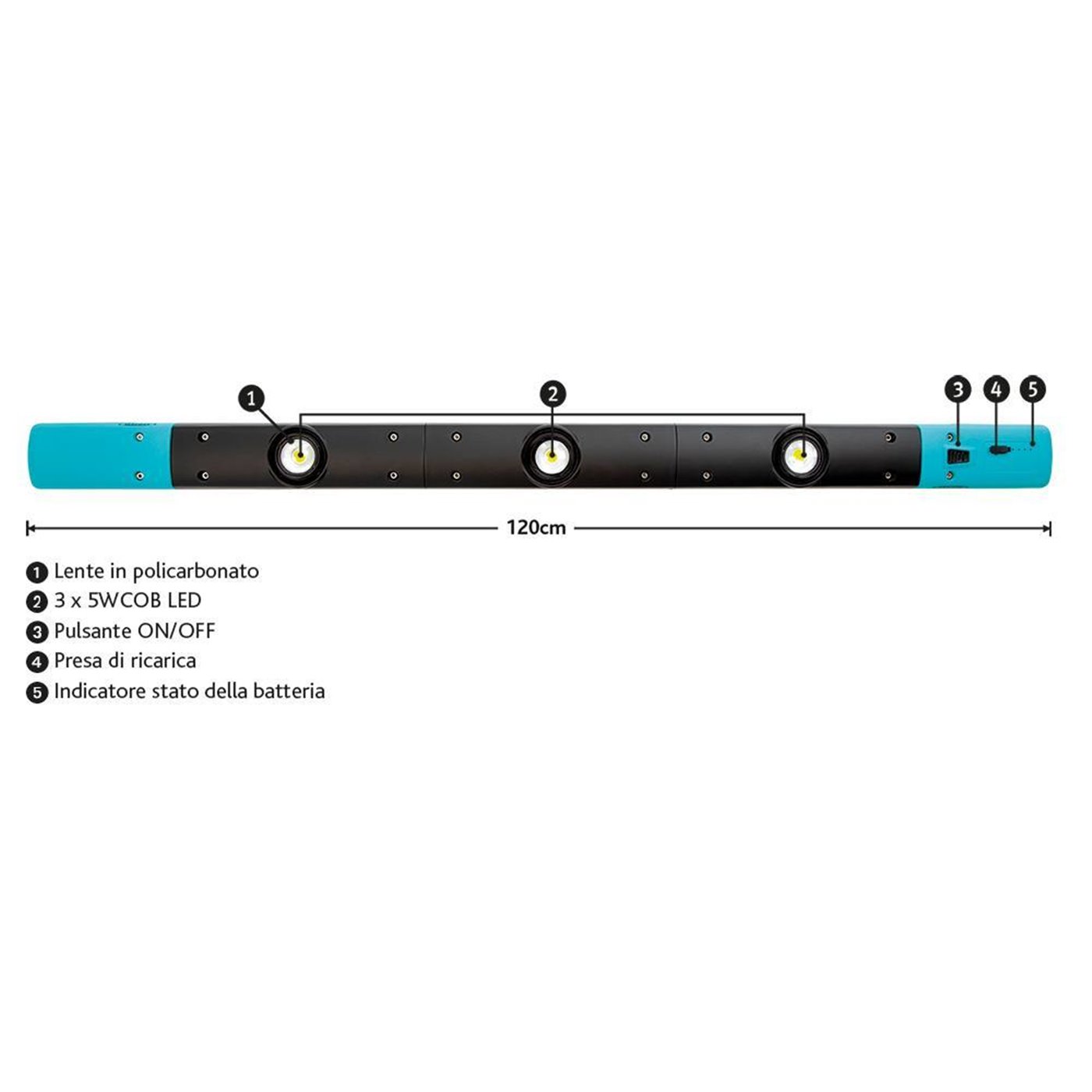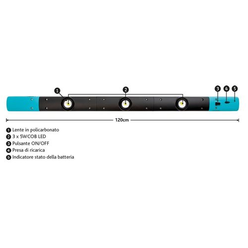 Barra magnetica a led orientabili, con batteria Li-ion ricaricabile da 10400mAh. Provvista di 3 fari a led da 5W, orientabili di 40° per illuminare dove necessario. Potenza luminosa fino a 1000 lumen e luce bianchissima fino a 6000K (simile alla luce diurna) grazie alla tecnologia COB LED. Angolo di illuminazione di 60°. Robusta struttura in policarbonato, ABS e alluminio. Include adattatore di rete AC. Interruttore per 1/2/3 lampade. Tempo di ricarica batteria: 6,5 ore (circa). Autonomia batteria: 5 ore (3 lampade) / 10 ore (2 lampade) / 16 ore (1 lampada). Potenza luminosa: 1000 (3 lampade) / 675 (2 lampade) / 350 (1 lampada).
