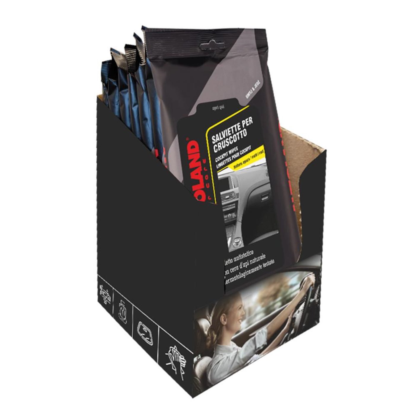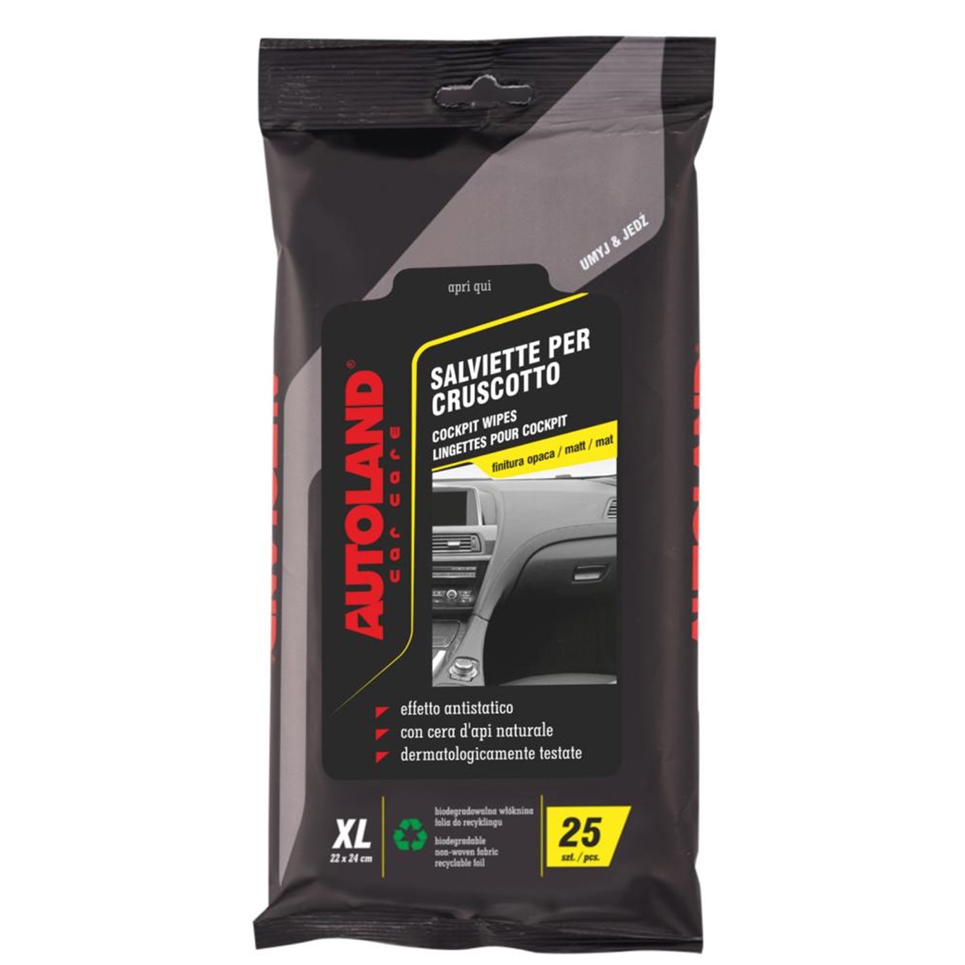 Salviette detergenti appositamente studiate per pulire e proteggere il cruscotto e tutte le parti in plastica, vinile e gomma all’interno dell’auto, lasciando la superficie opaca e satinata. Rimuovono impronte, macchie e altri tipi di sporco. Con cera d’api naturale che ravviva il colore e protegge la plastica dall’invecchiamento. Antistatiche, non lasciano residui sulle superfici pulite. Rilasciano nell’abitacolo un gradevole profumo. Dermatologicamente testate. In tessuto non tessuto biodegradabile, che si decompone in oltre il 90% entro 12 settimane dall’uso. lmballaggio in film PE omogeneo per un facile riciclaggio. Confezione da 6 buste con 25 salviette ciascuna.