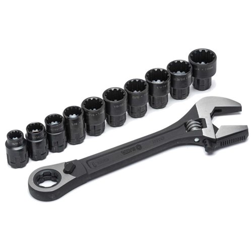 Set composto da 1 chiave regolabile da 8” 3 in 1 e 10 bussole Vortex multi-impronta: 10 mm (3/8”), 11 mm (7/16”), 12 mm (15/32”), 13 mm (1/2”), 14 mm (9/16”), 15 mm (19/32”), 16 mm (5/8”), 17 mm (11/16”), 18 mm (23/32”), 19 mm (3/4”).
