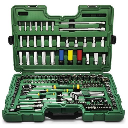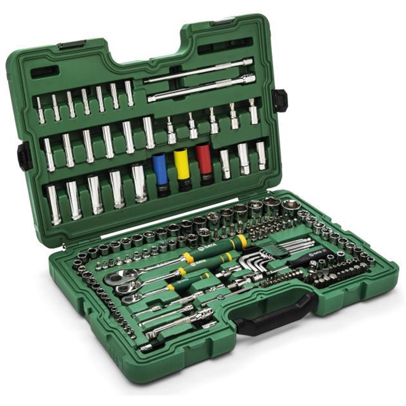 Set chiavi metriche esagonali composto da: 3 cricchetti a sgancio rapido 1/4”, 3,8” e 1/2” 72 denti - 1 adattatore 3,8”F x 1/2”M - 2 prolunghe 1/4” da 2” e 4” - 2 prolunghe 3/8” da 3” e 10” - 2 prolunghe 1/2” da 5” e 10” - 1 prolunga flessibile 1/4” 150 mm - 3 giunti universali 1/4”, 3/8” e 1/2” - 1 impugnatura a T scorrevole 1/4” - 1 impugnatura manuale 1/4” - 1 bussola per candele 3/8” 18 mm - 2 bussole per candele 1/2” 16 e 21mm - 13 Bussole metriche esagonali 1/4” 3, 5, 4, 4.5, 5, 6, 7, 8, 9, 10, 11, 12, 13, 14 mm - 7 bussole metriche esagonali lunghe 1/4” 4, 5, 6, 7, 8, 9, 10 mm - 10 bussole metriche esagonali 3/8” 10, 11, 12, 13, 14, 15, 16, 17, 18, 19 mm - 6 bussole metriche esagonali lunghe 3/8” 10, 11, 12, 13, 14, 15 mm - 19 bussole metriche esagonali 1/2” 10, 11, 12, 13, 14, 15, 16, 17, 18, 19, 20, 21, 22, 23, 24, 26, 27, 30, 32 mm - 5 bussole metriche esagonali lunghe 1/2” 16, 17, 18, 19, 22 mm - 3 bussole metriche con protezione nylon 1/2” 17, 19, 21 mm - 21 bit 1/4” lunghezza 25mm (Phillips Ph1/Ph2/Ph3, taglio 4/5.5/6.5, esagonali 3/4/5/6/7 mm, Torx T8/T10/T15/T20/T25/T27/T30, Pozidriv Pz1/Pz2/Pz3) - 4 bussole Torx 3/8“ T45, T50, T55, T60 - 3 bussole E-Torx 1/4” E4, E6, E8 - 5 bussole triple square 1/2" M5, M6, M8, M10, M12 - 8 bussole E-Torx 3/8” E5, E7, E10, E11, E12, E14, E16, E18 - 2 bussole E-Torx 1/2” E20 e E24 - 1 set chiavi esagonali a L lunghe Ballend 9 pz (1, 5, 2, 2,5, 3, 4, 5, 6, 8, 10 mm) - 22 bit 1/4” lunghezza 25mm (Phillips Ph0/Ph1/Ph2/Ph3, esagonali 2/2,5/3/4/5/6/7/8 mm, taglio 6.5 mm, Torx T10/T15/T20/T25/T27/T30, Pozidriv Pz1/Pz2/Pz3) - 21 Bit 5/16” lunghezza 30 mm (Phillips Ph3/Ph4, esagonali 8/10/12/14 mm, taglio 8/10/12 mm, Torx T40/T45/T50/T55/T60/T70, Tamper-Torx T40/T45/T50/T55/T60/T70).