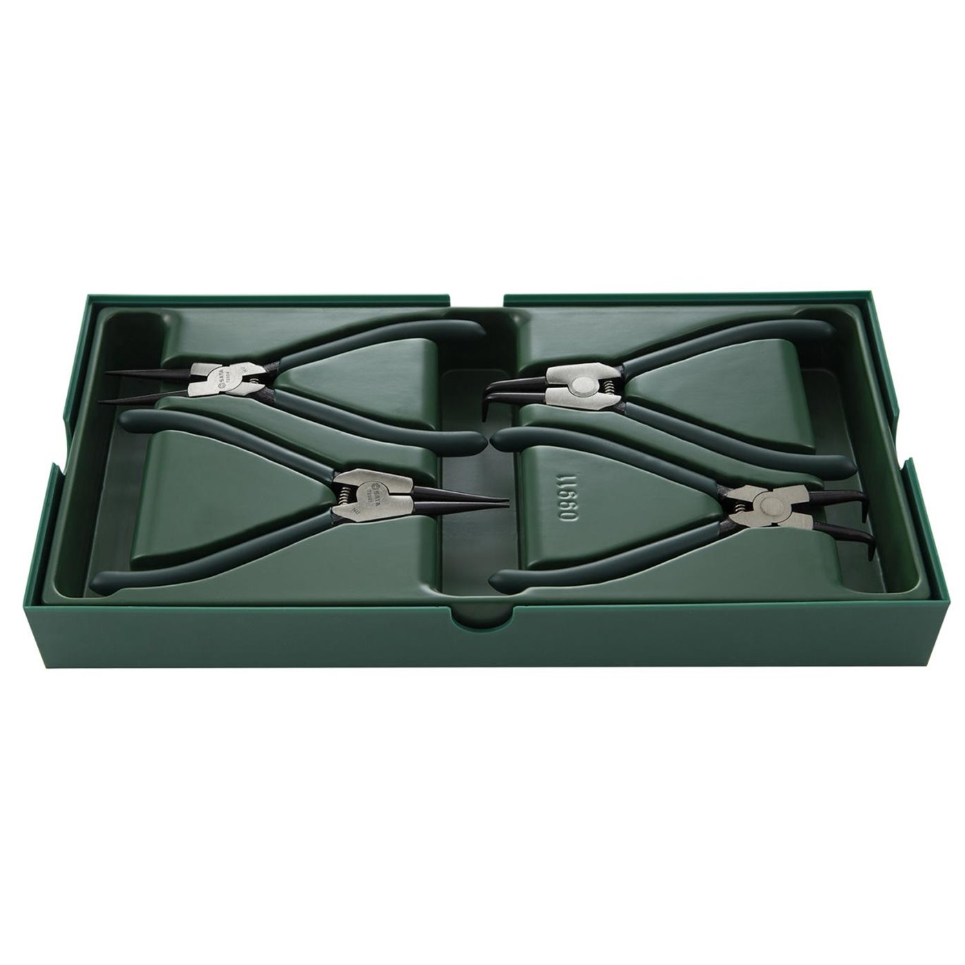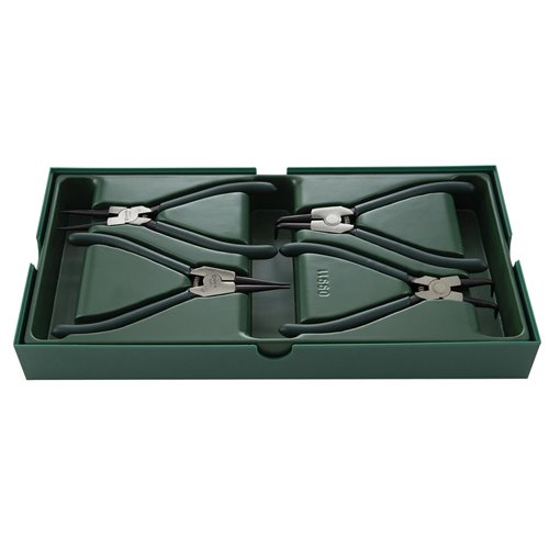 Set a vassoio pinze Seeger. Contenuto: 1 esterni becchi dritti 7”, 1 esterni becchi piegati 7”, 1 interni becchi dritti 7”, 1 interni becchi piegati 7”.