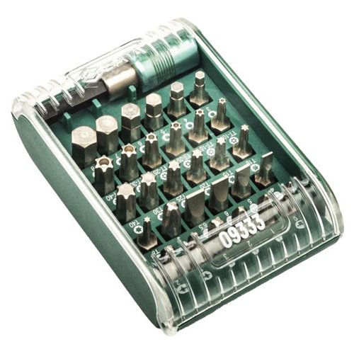 Set composto da: 1 portainserti magnetico Quick-Change, 30 bit 25 mm 1/4” (taglio 4/5/6/6,5 - Phillips Ph0/Ph1/Ph2/Ph3 - esagonali 3/4/5/6/7/8 - Torx T8/T10/T15/T20/T25/T30/T40 - Tamper Torx T10/T15/T20/T25/T30/T40 - Pozidriv Pz1/Pz2/Pz3).