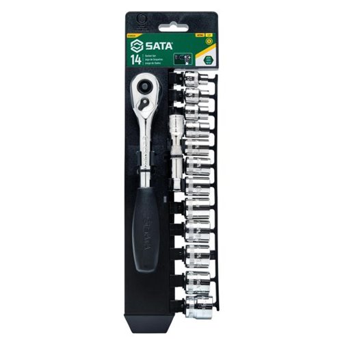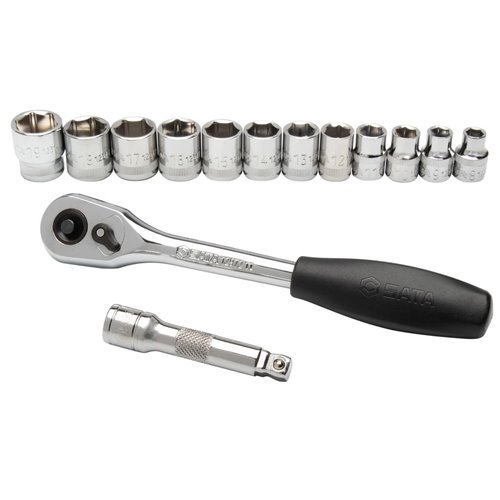Set composto da: 1 cricchetto a sgancio rapido, 12 bussole metriche esagonali 8/9/10/11/12/13/14/15/16/17/18/19 mm, 1 prolunga oscillante 3".