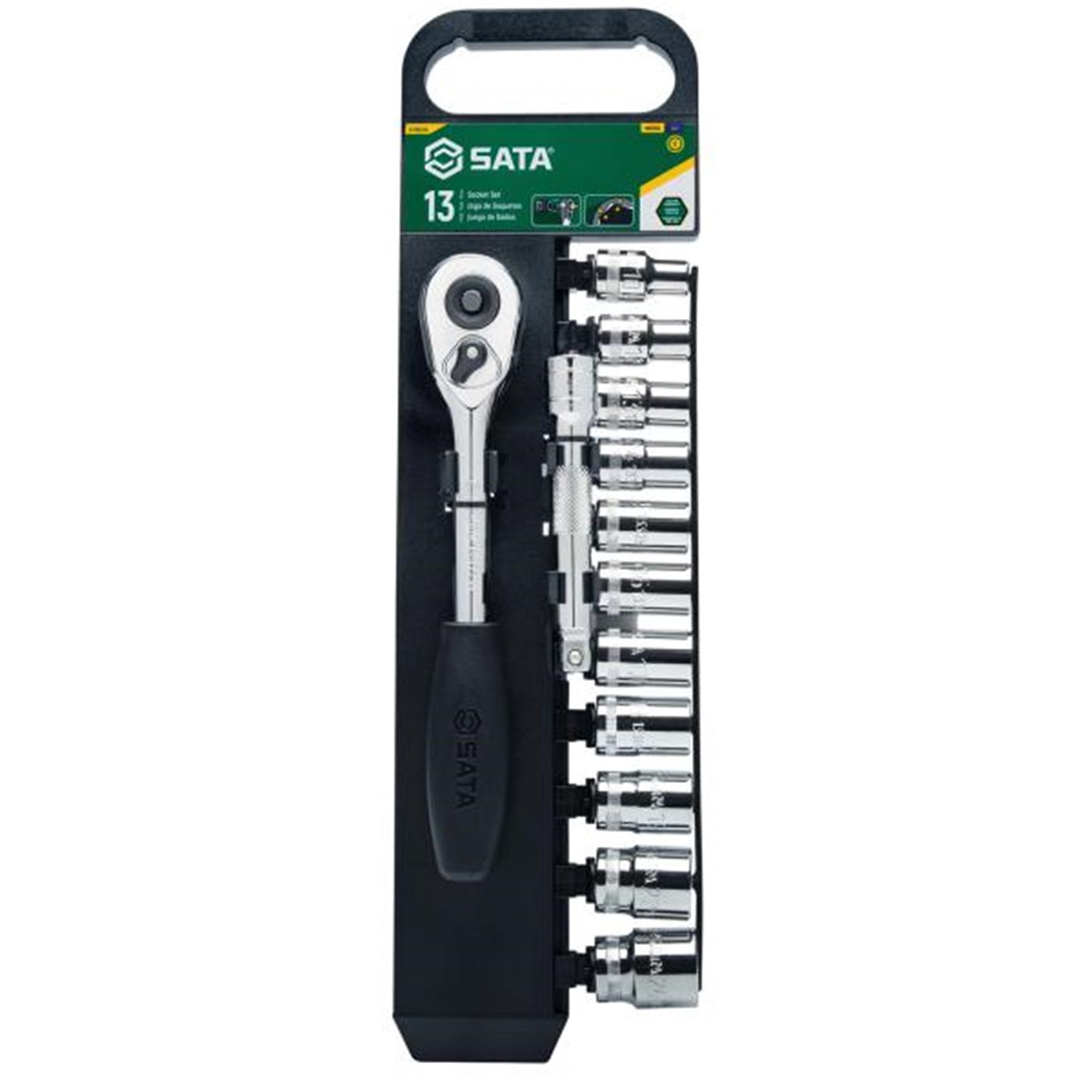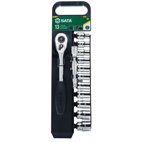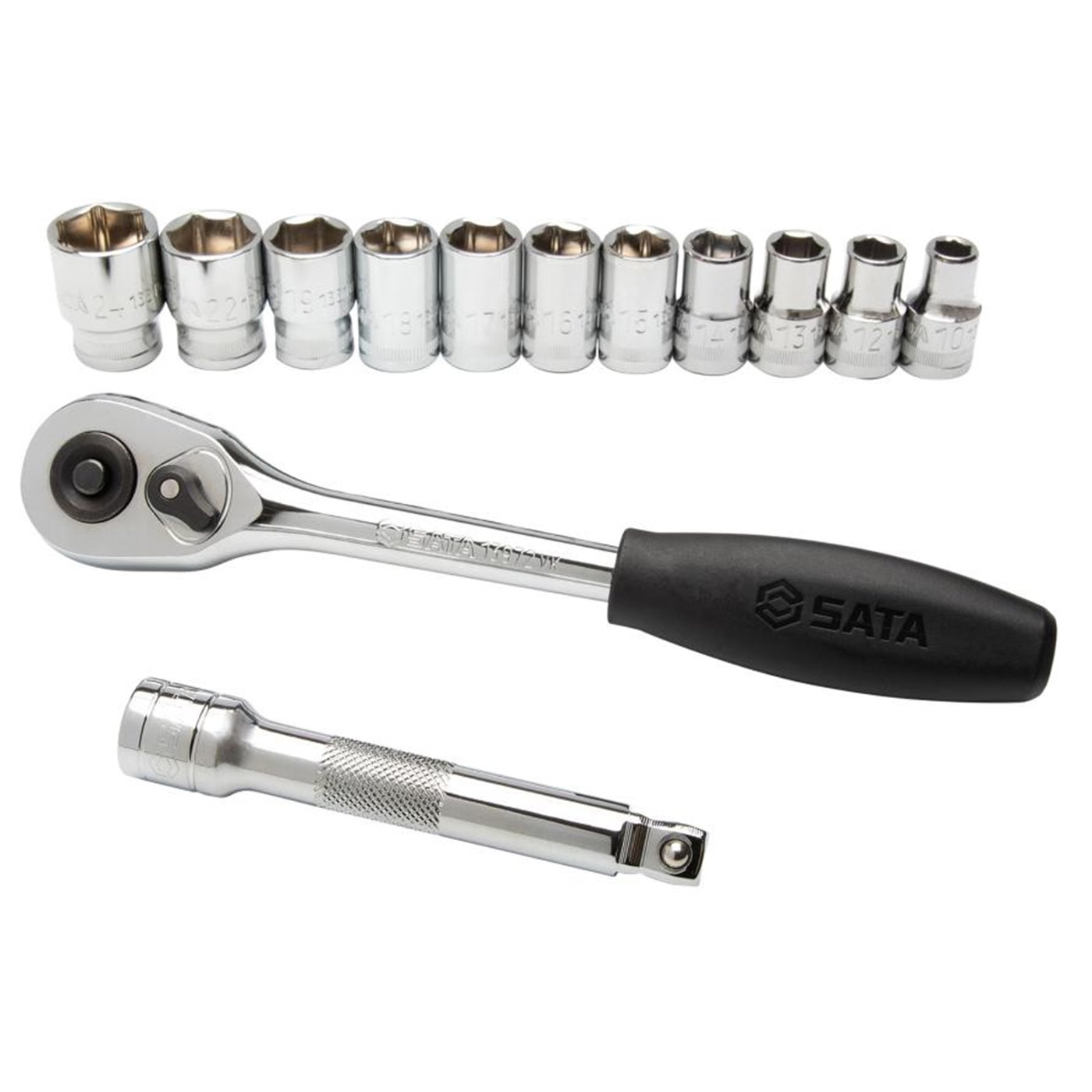 Set composto da: 1 cricchetto a sgancio rapido, 11 bussole metriche esagonali 10/11/12/13/14/15/16/17/18/19/22 mm, 1 prolunga oscillante 5".