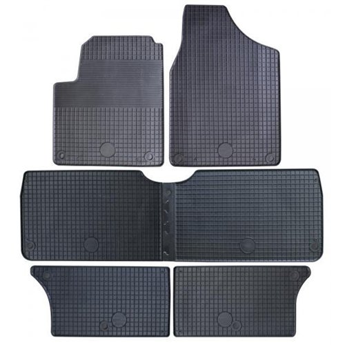 Serie completa 6 tappeti (anteriori+posteriori) in gomma di alta qualità, inodore e facili da pulire. Realizzati su misura: proteggono perfettamente il pianale senza ricorrere ad adattamenti. Con fori per il fissaggio ai fix point originali del veicolo. Per FORD Galaxy 95>06 (ant. + post. seconda e terza fila) (Mk1).