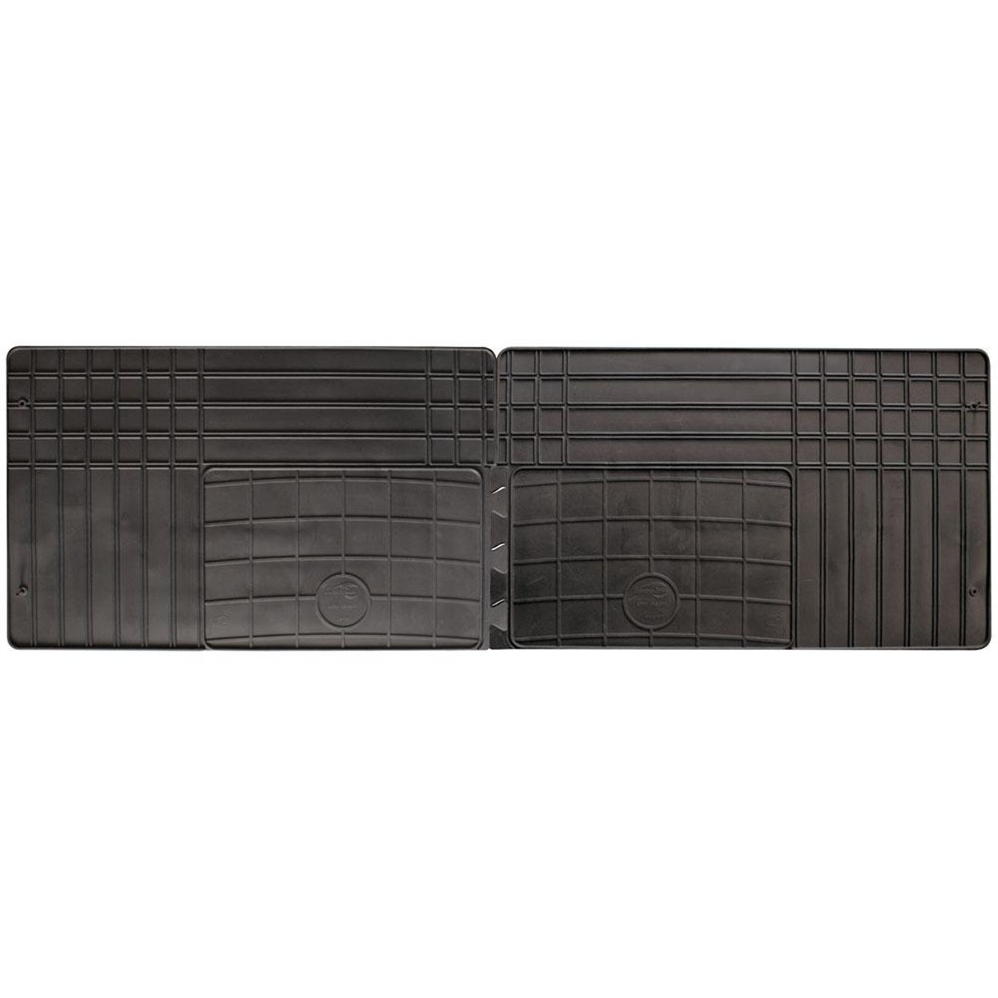 Tappeti posteriori universali in gomma per monovolume. In due pezzi (base destra e base sinistra) separati, predisposti con un incastro a coda di rondine per incastrarsi tra loro e formare un corpo unico. Sagomabili per adattarsi perfettamente alla seconda o terza fila di sedili dei monovolume. Con linee di taglio bordate per una finitura perfetta anche dopo il taglio. Materiale di alta qualità: gomma allo stirene SBR, robusta, durevole ed inodore. Design moderno. Facili da pulire, lavabili con idropulitrice.