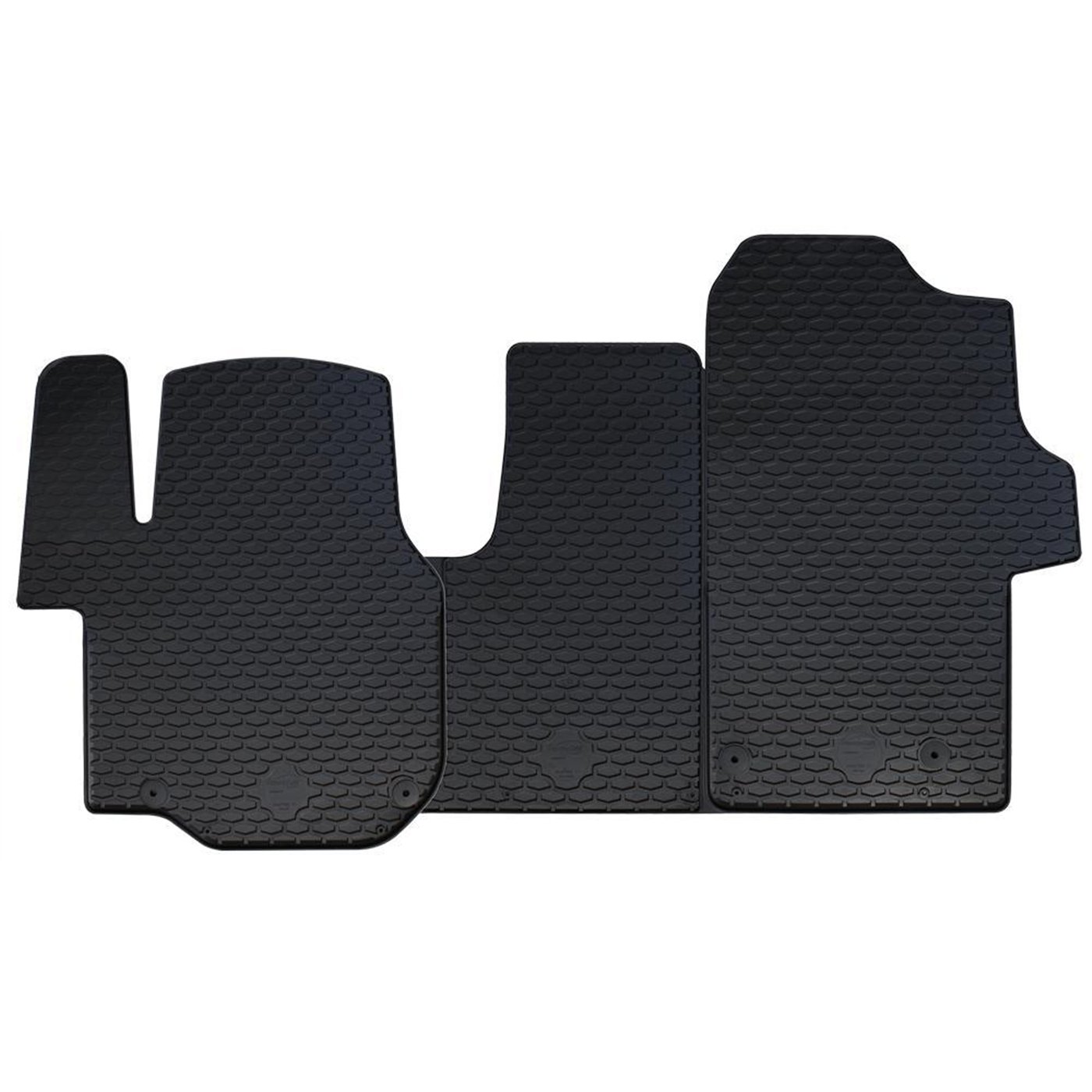 3 tappeti anteriori in gomma di alta qualità, inodore e facili da pulire. Realizzati su misura: proteggono perfettamente il pianale della vettura senza ricorrere ad adattamenti. Con bottoni in plastica per il fissaggio ai fix point originali del veicolo. Per MAN TGE 17> (anche elettrico) - VOLKSWAGEN Crafter 17> (SY) (anche elettrico).