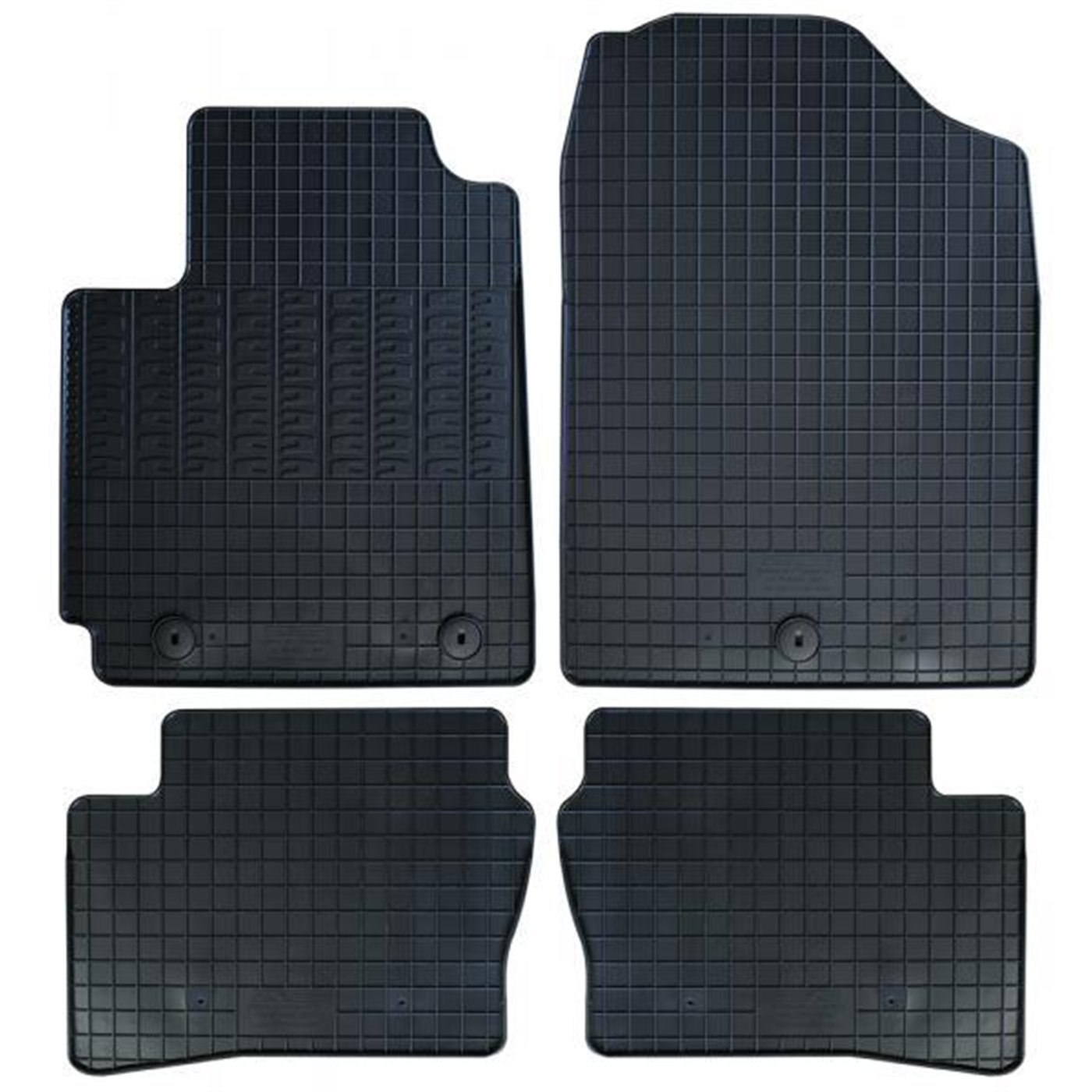 Serie completa 4 tappeti (anteriori+posteriori) in gomma di alta qualità, inodore e facili da pulire. Realizzati su misura: proteggono perfettamente il pianale della vettura senza ricorrere ad adattamenti. Con bottoni in plastica per il fissaggio ai fix point originali del veicolo. Per KIA Picanto III 17>24, 24> (JA).
