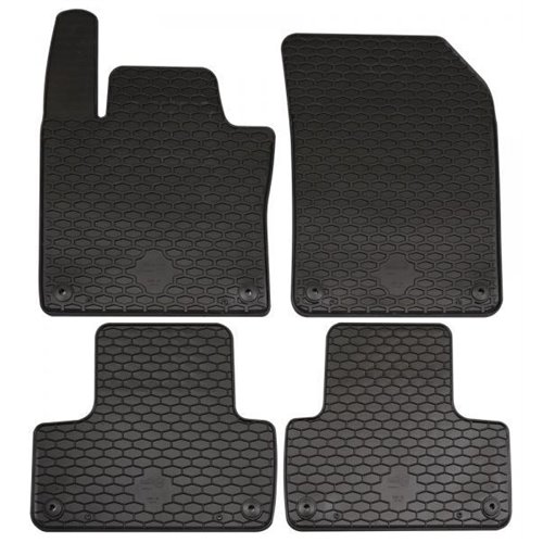 Serie completa 4 tappeti (anteriori+posteriori) in gomma di alta qualità, inodore e facili da pulire. Realizzati su misura: proteggono perfettamente il pianale della vettura senza ricorrere ad adattamenti. Con bottoni in plastica per il fissaggio ai fix point originali del veicolo. Per VOLVO XC60 II 17>21, 21> (246) (anche ibrida).