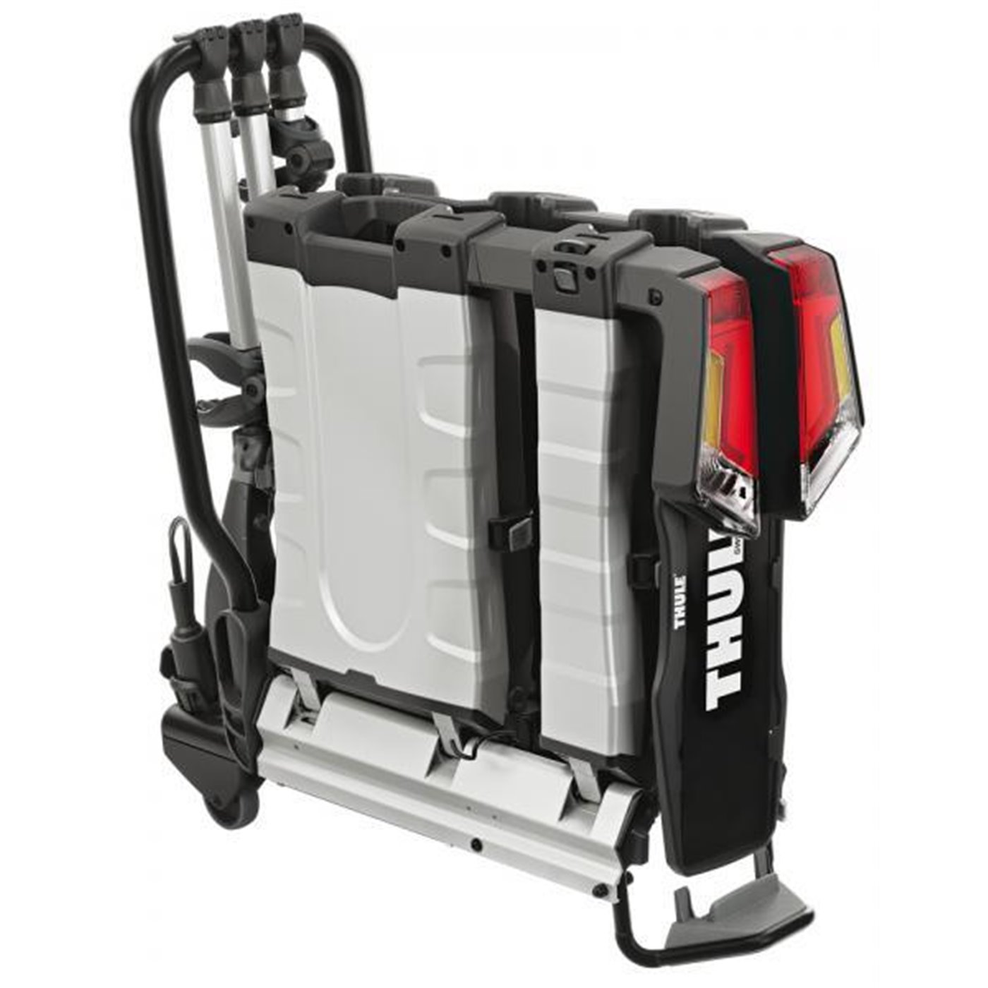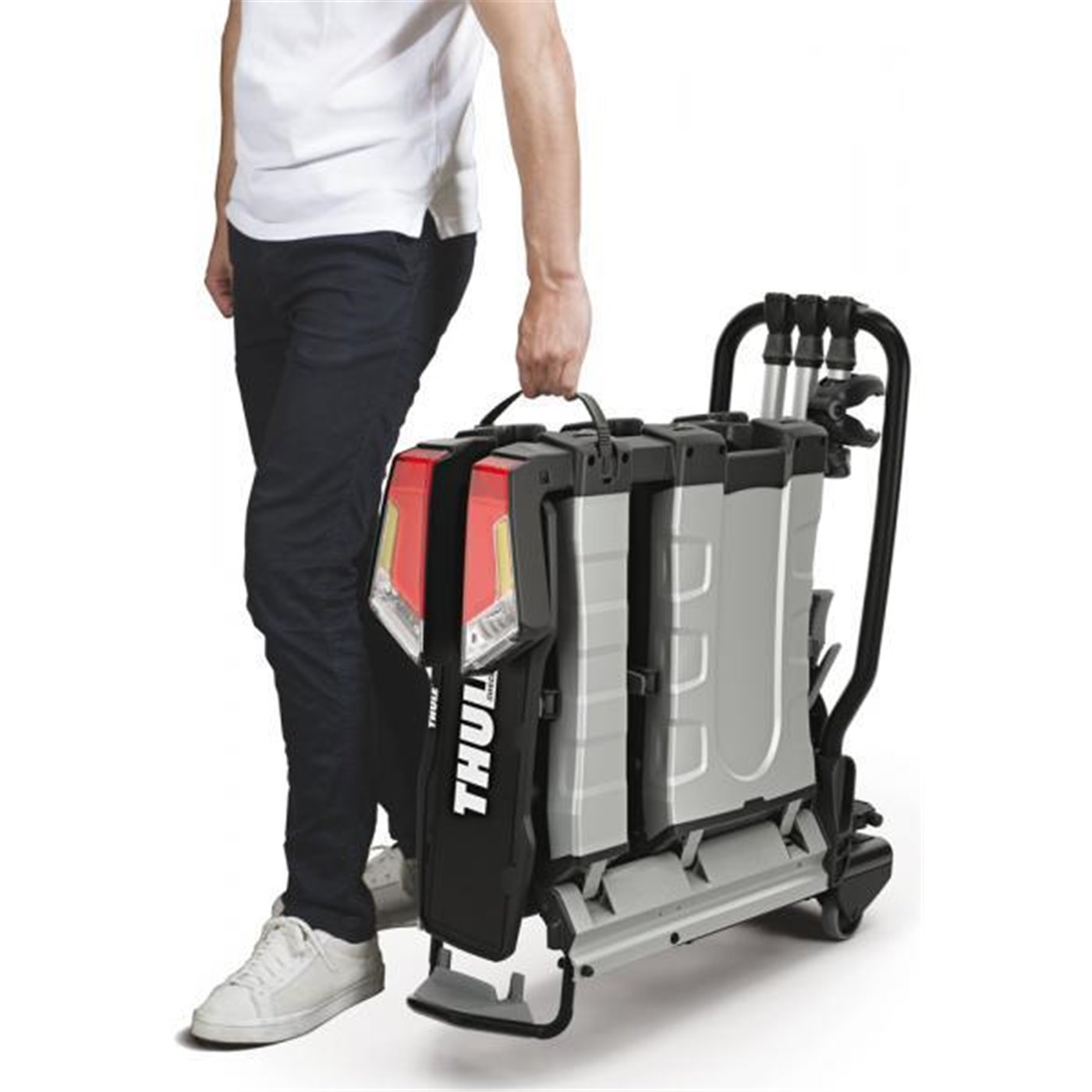 Portabici da gancio traino compatto e pieghevole, in grado di trasportare 3 bici di qualsiasi tipo comprese e-bike e mountain bike pesanti. Completamente ripiegabile per agevolare montaggio, trasporto e rimessaggio: una volta piegato, non ingombra più di una valigia normale e può pertanto essere facilmente riposto nel bagagliaio o in casa. Facile da montare: in solo due operazioni si monta sul gancio traino, si apre ed è pronto per l'uso. Provvisto di braccetti blocca telaio rimovibili con pomello AcuTight dotato di indicatore di coppia che fa “click” una volta raggiunto il serraggio ottimale, e di lunghe cinghie regolabili con cricchetto per un fissaggio semplice e sicuro delle ruote (con pneumatici larghi fino a 4.7"). Con pratica funzione basculante a pedale per un facile accesso al bagagliaio anche con le bici montate. Antifurto grazie alla doppia serratura, bici su portabici e portabici su gancio traino. Compatibile con telai aventi tubi di diametro 22-80 mm. Distanza tra le canaline poggiaruota: 22/19 cm. Portata: 60 kg. Peso max di ogni bici: 30 kg. Dimensioni: 83 x 123 x 86 cm (83 x 31 x 86 chiuso). Peso: 23,1 kg. Spina elettrica a 13 poli (7 poli con adattatore cod. 600009906). Ruote e maniglie di trasporto integrate per un agevole trasporto. Omologato TUV/EuroBe e conforme alle norme City Crash.