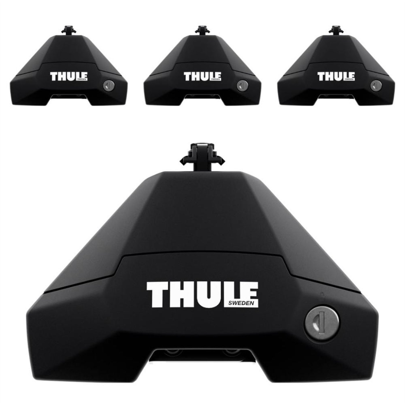 Set 4 piedi per barre portatutto Thule. Specifico per auto con tetto standard (senza barre longitudinali o punti fissi di aggancio). Da completare con kit di fissaggio (vedi Guida all'acquisto Thule). Serrature incluse. Portata: 75 kg.