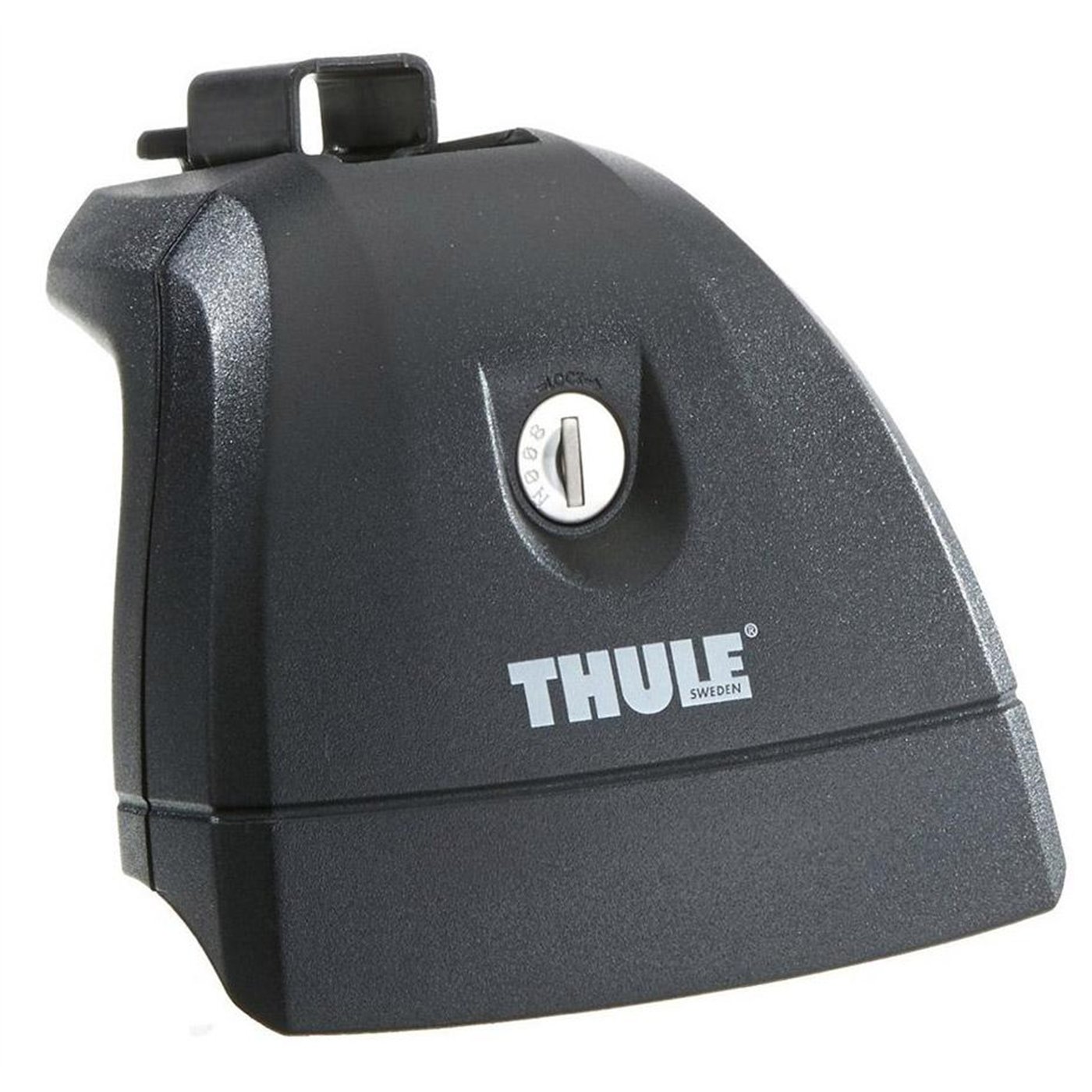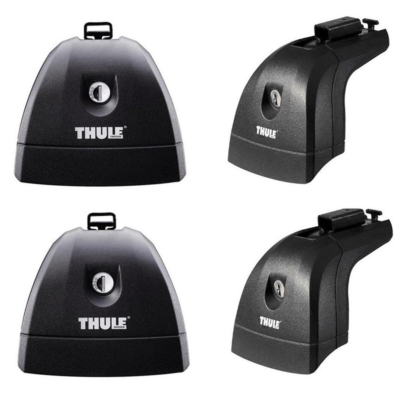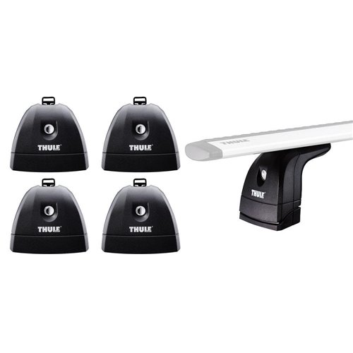 Set 4 piedi per barre portatutto Thule. Specifico per auto con punti fissi di aggancio. Da completare con kit di fissaggio. Serrature incluse. Portata: 100 kg. Altezza piede (distanza tra la base del piede ed il punto di contatto con la barra): 10,5 cm. Certificato TUV e conforme alle norme CityCrash.