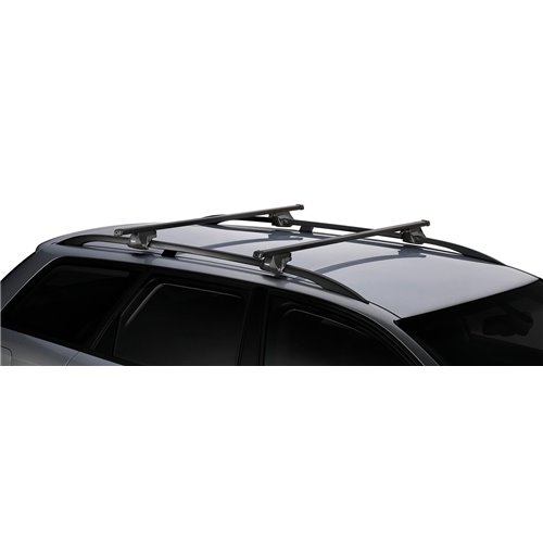 Coppia barre portatutto in acciaio complete di piedi, per auto provviste di barre longitudinali di dimensioni comprese tra 18 e 50 mm. Antifurto grazie allo speciale utensile in dotazione. Altezza piede (distanza tra la base del piede ed il punto di contatto con la barra): 8,4 cm. Portata: 100 kg. Lunghezza: 135 cm.