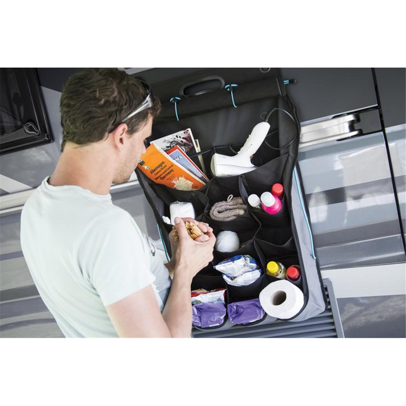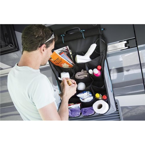 Organizer da parete ideale per riporre qualunque tipo di oggetto. Con 14 tasche, 2 tasche extra in tessuto a rete e 2 cavi elastici laterali. Design durevole e resistente agli agenti atmosferici, in 100% poliestere. Ripiegabile per un semplice rimessaggio. Chiusura con cerniera integrata per un agevole accesso. Maniglia integrata per il trasporto. Dimensioni: 50 x 85 cm.