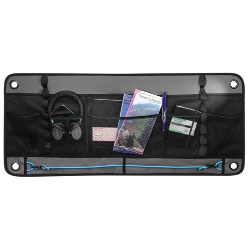Pratico organizer con 5 tasche in tessuto a rete, 14 asole elastiche, 1 portapenne e 2 portarotoli da cucina. Design durevole e resistente agli agenti atmosferici, in 100% poliestere. Ripiegabile per un semplice rimessaggio. Maniglia integrata per il trasporto. Dimensioni: 90 x 40 cm.